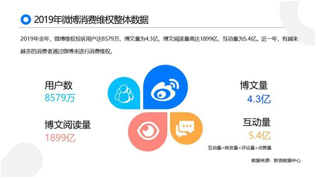 ? 根據(jù)微博數(shù)據(jù)顯示,2019年年微博維權(quán)投訴用戶達(dá)8579萬,博文量為4.3億,博文閱讀量高達(dá)1899億,互動量(轉(zhuǎn)發(fā)量+評論量+點(diǎn)贊量)為5.4億。近一年,有越來越多的消費(fèi)者通過微博來進(jìn)行消費(fèi)維權(quán),而且更習(xí)慣求助于權(quán)威媒體和政府機(jī)構(gòu)來解決消費(fèi)中遇到的問題。